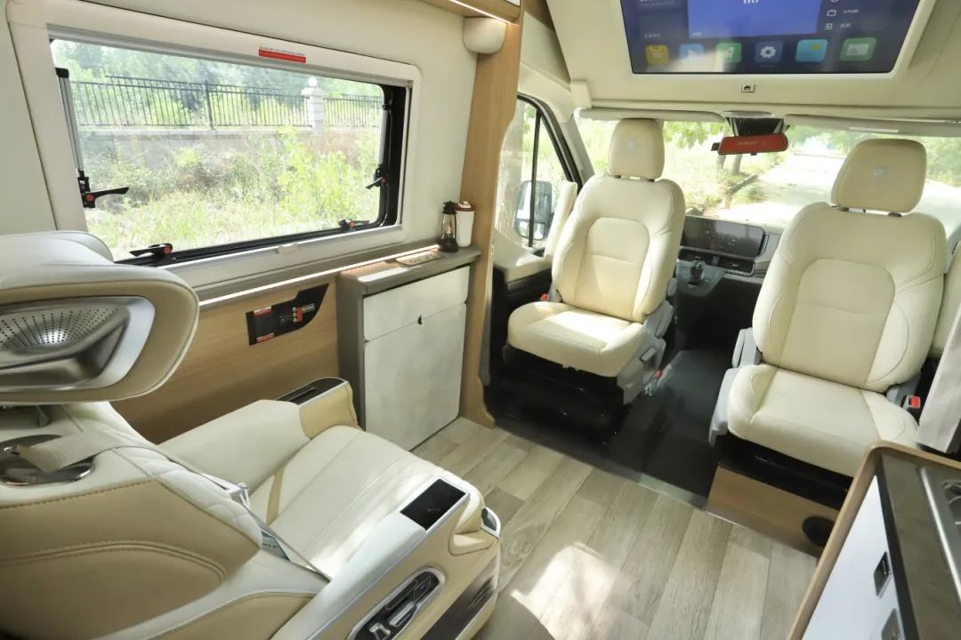 進入車內(nèi)先來看看這獨具特色的會客區(qū),非常寬敞明亮??!一改以往的兩張汽車獨立座椅,升級為豪華航空座椅,可進行通風、加熱、按摩等功能,原本的四座改為了三座,地面可活動空間更大了。