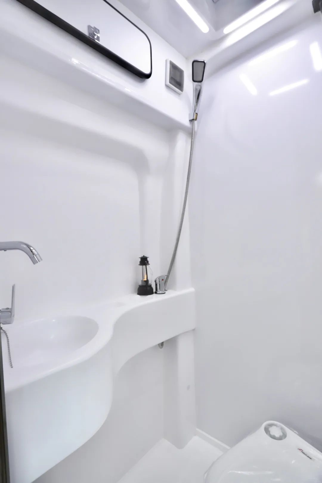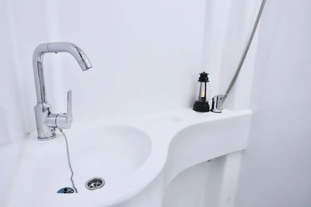 另外可調(diào)節(jié)角度的冷熱水龍頭、洗澡有手持式的淋浴花灑,統(tǒng)統(tǒng)準備齊全。馬桶則是便攜式的,好拿好放。