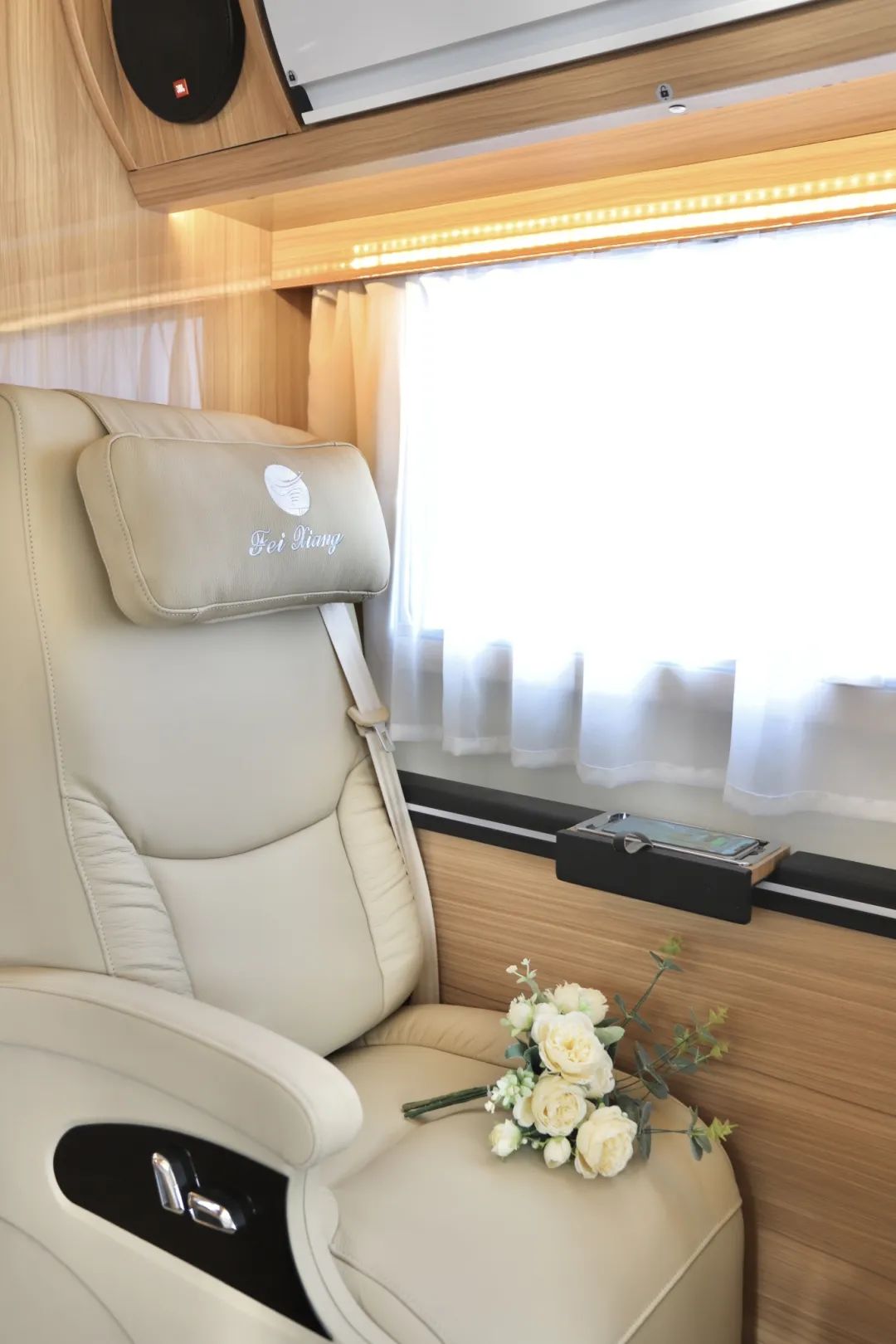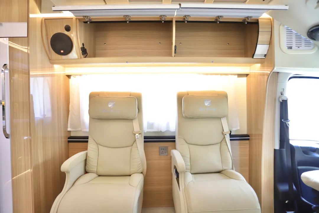 座椅上方兩側(cè)還有儲(chǔ)物吊柜,采用的是鋁合金的材質(zhì),無異味,無甲醛,更輕量化,由電動(dòng)鎖控制,起身時(shí)不易磕碰到頭部,更加的安全。內(nèi)部的空間容量也非常大,放置出行帶的厚被褥再合適不過了。