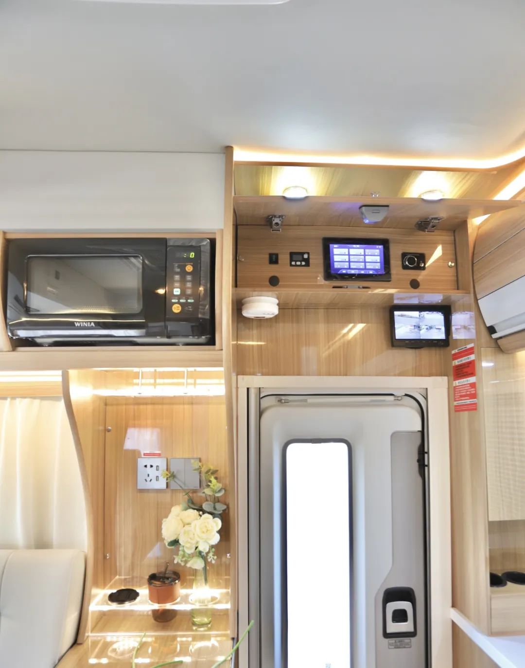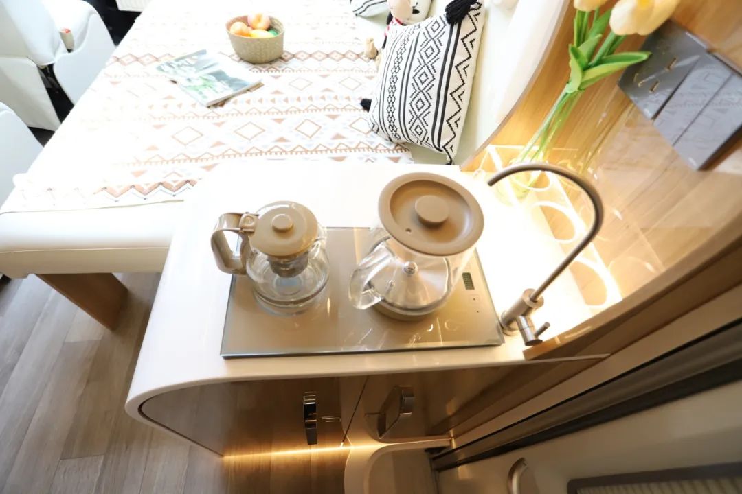進(jìn)門處的茶吧臺(tái)喜歡喝茶的車友應(yīng)該非常喜歡它,燒水,煮茶非常方便。房車專用的凈水器,可直接過濾掉水中的臟東西,達(dá)到直飲水的標(biāo)準(zhǔn)。內(nèi)側(cè)還有高腳杯置物架和紅酒置物架。上方則是微波爐,加熱簡餐,方便又快捷。
