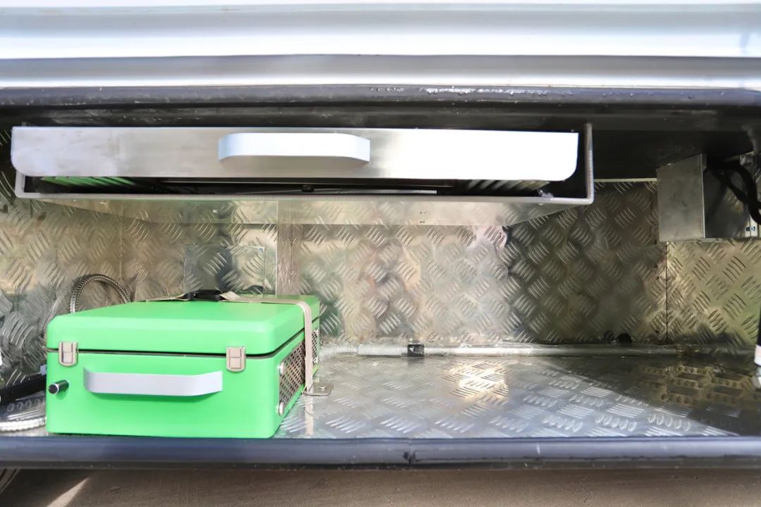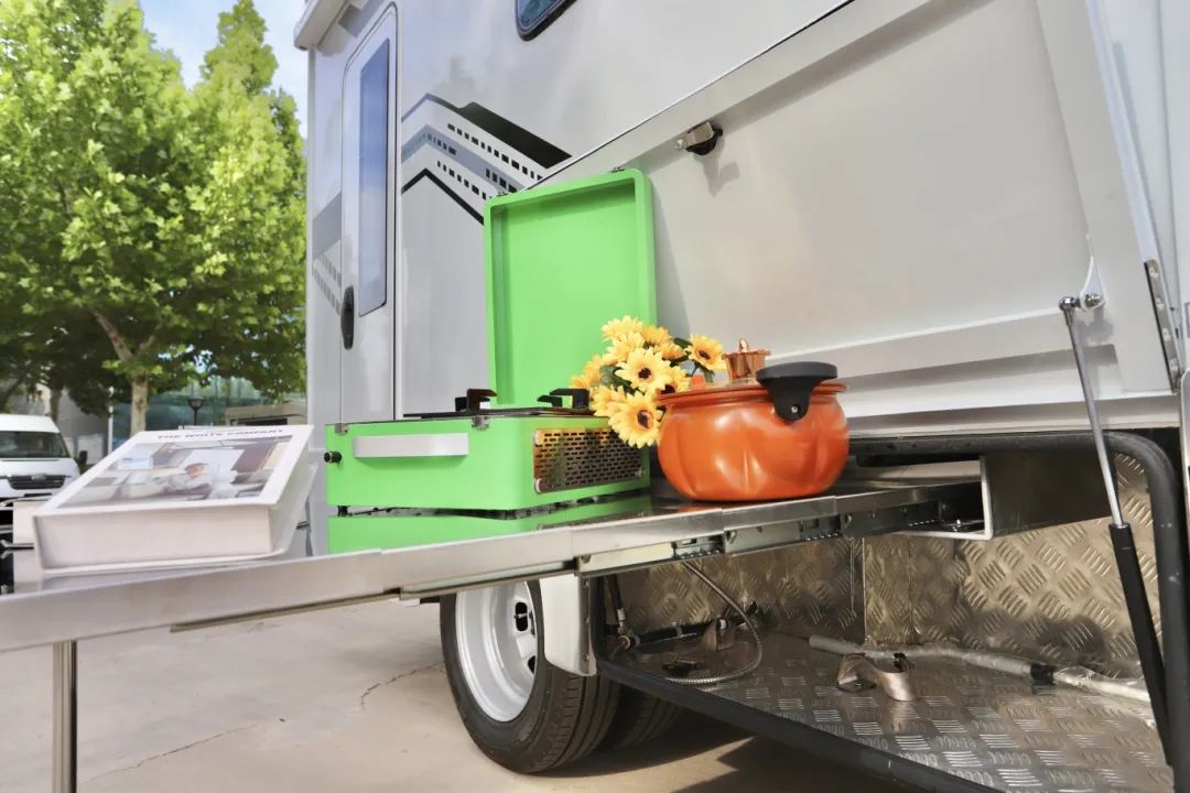 當(dāng)您想在室外野餐露營同樣可以實(shí)現(xiàn)。外置廚房就位于副駕駛一側(cè),采用的同樣是柴油爐,與內(nèi)置廚房一樣,火力值可以任意調(diào)節(jié)。平時(shí)還可以用不銹鋼桌板吃飯,打理也非常方便。里面還可以放一些器材設(shè)備等,做的是防滑設(shè)計(jì),還安裝了綁帶,這樣在行車過程中不會(huì)來回晃,也不會(huì)造成異響。上方還有遮陽棚與LED燈,在野餐時(shí)打開更利于您操作。