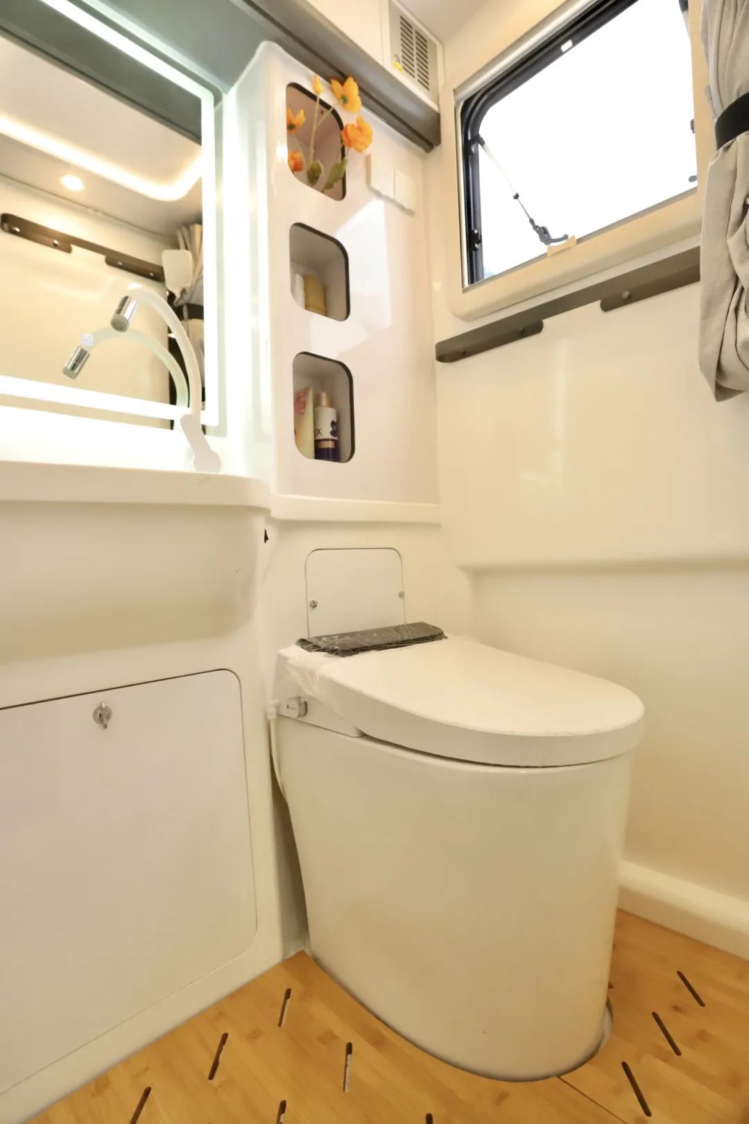 水電方面配備5000w逆變器、48V發(fā)電機(jī)、800AH鋰電、頂部滿鋪了1280w太陽能板;260L清水以及160L灰水。
