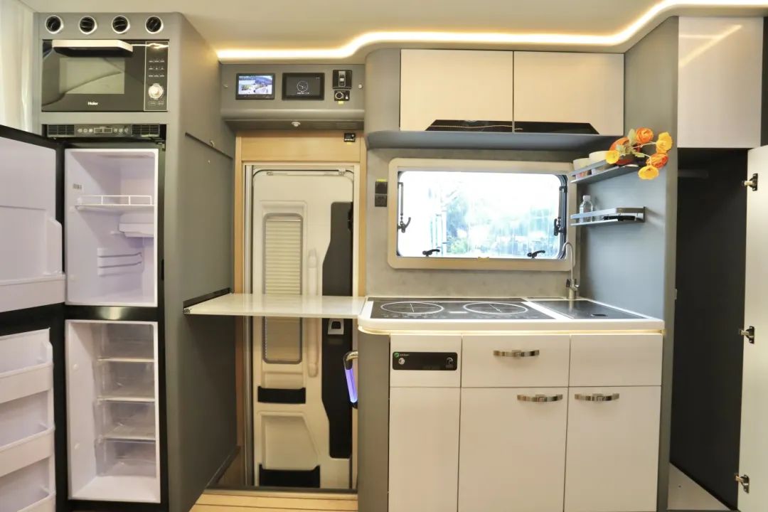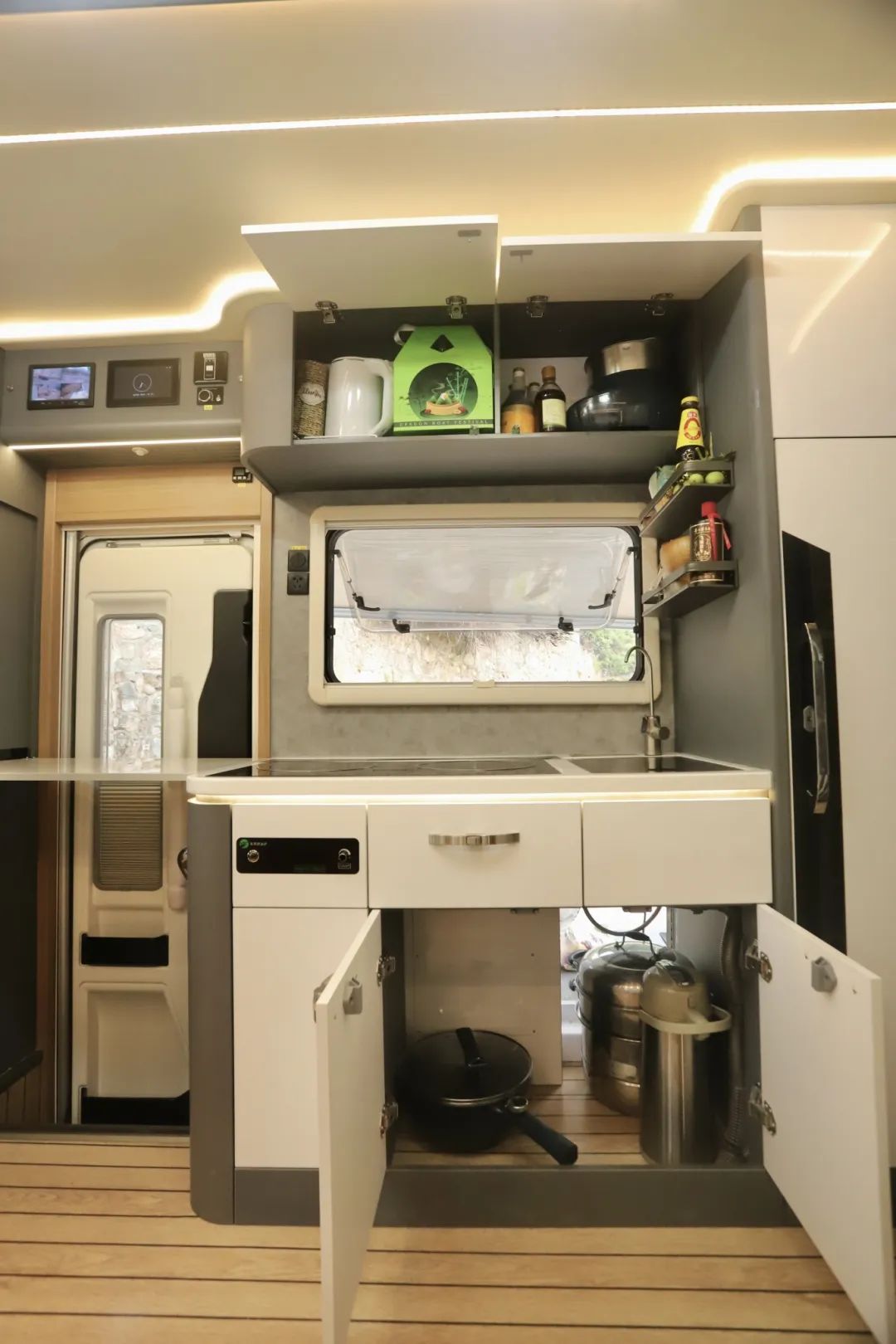 會客廳對面為內(nèi)置廚房區(qū)域,獨(dú)立分區(qū)溫控的168L房車專用冰箱、微波爐,將墻邊延長板放下1米8的超大臺面供您發(fā)揮。