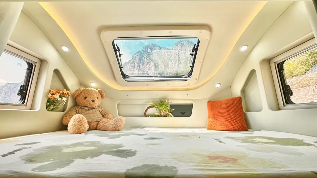 來到車內(nèi)會客廳,飛翼觀景窗內(nèi)部可下拉出一整扇防蚊紗簾,阻隔蚊子的同時絲毫不影響欣賞外面的風(fēng)景。