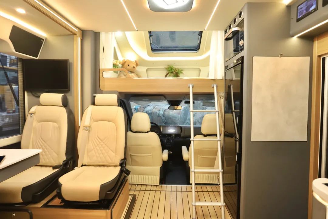 駐車時可以進(jìn)行升層拓展,內(nèi)部兩層不包括駕駛室可使用空間可達(dá)到18.27個平方,要知道以往的B型車、T行車空間才不到10個平方哦,更大的空間讓您擁有更愜意的旅行生活。在車身四周設(shè)置有四根液壓駐車支腿,保證整車的平衡和穩(wěn)定性;主駕駛一側(cè)不僅向外拓出了60公分,上方還有一個開口接近90度的飛翼觀景大天窗,觀景視野那是一級棒!