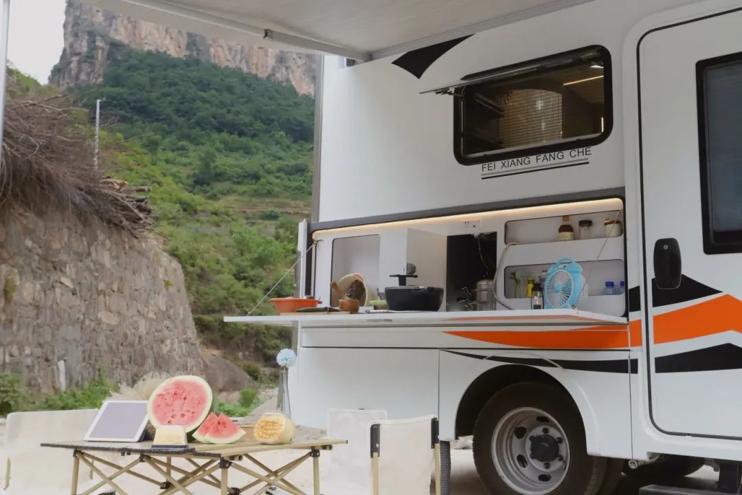 副駕駛一側(cè)就是本車主要的戶外生活區(qū)了,當(dāng)天氣溫和,陽光微風(fēng)的時候,打開戶外遮陽棚,在這里乘涼真的愜意十足。
