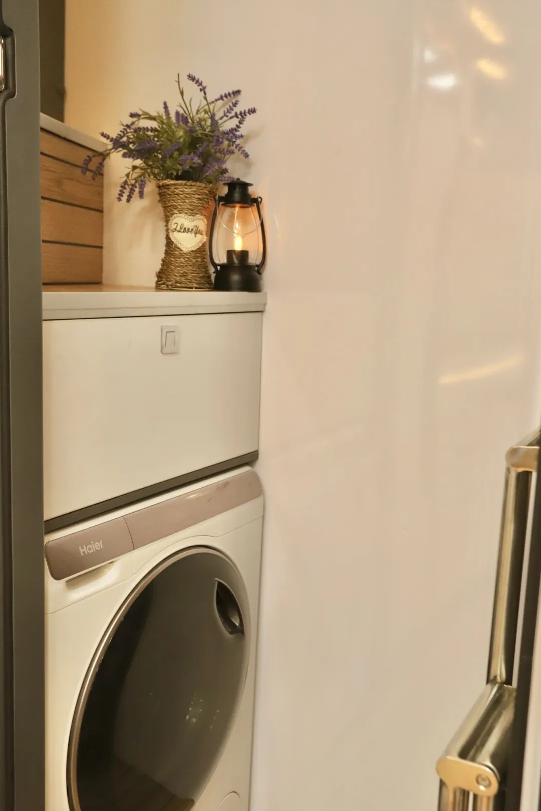 一樓的設(shè)施就滿足我們在不升層不拓展的時候100%的日?;顒樱ㄍ堑臉翘菥驮谛l(wèi)生間旁邊,第一部分為可折疊式的樓梯,將它收起來,里側(cè)還放置了3.5公斤的洗衣機(jī),長期旅行也不用手搓了。