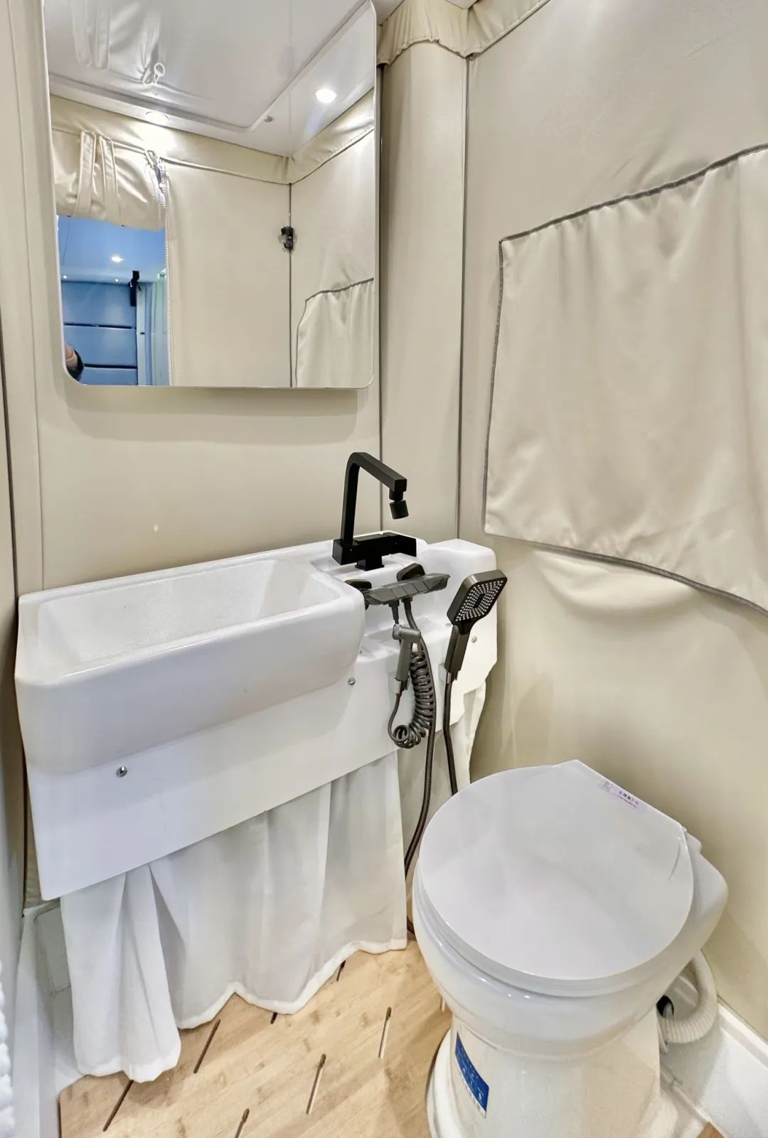 房車(chē)?yán)锩嬗袃蓚€(gè)衛(wèi)生間真的很少見(jiàn),這款車(chē)上也給您實(shí)現(xiàn)了,采用可折疊的防水材質(zhì),這樣二層降下去的時(shí)候衛(wèi)生間也一起折疊,互不影響;里面洗漱臺(tái)、電動(dòng)粉碎馬桶,還有一個(gè)穿衣鏡,這樣晚上起夜也不用上下樓來(lái)回跑了;整個(gè)二樓升降過(guò)程中,衛(wèi)生間的洗漱臺(tái)以及整張床都會(huì)隨著升降,保證整個(gè)高度維持在50公分內(nèi),并不會(huì)影響我們正常的行車(chē)。