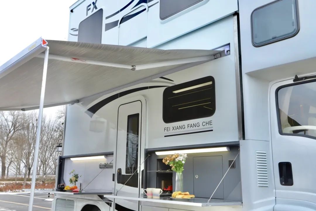 在中門(mén)兩側(cè),分別可以放下一個(gè)超大的操作平臺(tái),當(dāng)做廚房的操作臺(tái)面,下方儲(chǔ)物還放了一個(gè)液化氣的燃油罐,可以在戶外炒菜做飯,旁邊雙向抽屜以及貫通式的儲(chǔ)物空間都可以放餐具廚具,整車(chē)的電器控制倉(cāng)也放在了這里,方便后期維修升級(jí),兩側(cè)平臺(tái)上方還設(shè)置了上方內(nèi)嵌了四米的電動(dòng)遮陽(yáng)棚,平時(shí)乘涼賞景,舒適!