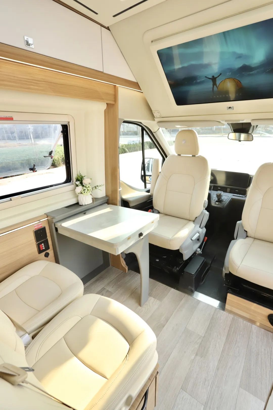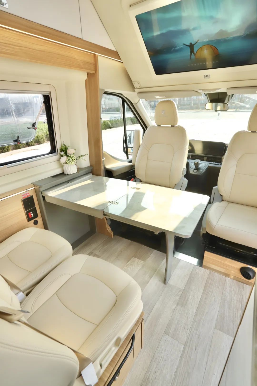 主副駕駛都可以進(jìn)行180度旋轉(zhuǎn),整體來(lái)說(shuō)就是一個(gè)小客廳,旁邊搭配升降折疊的桌子進(jìn)行使用。