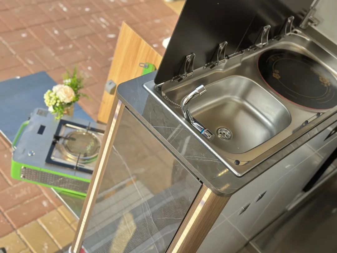 旁邊為室內(nèi)廚房操作臺(tái)面,為您安裝內(nèi)置柴油爐,采用微晶面板的形式,更加耐高溫?zé)o明火,在房車?yán)锩媸褂酶影踩?,同時(shí)燃料直接取自本車的油箱,在燃料供給上無(wú)須擔(dān)心,旁邊洗手池搭配冷熱水水龍頭,旁邊還設(shè)置了凈水裝置,這樣即使是凈水箱內(nèi)部的水也可以放心飲用了,上方有下沉式的抽油煙機(jī),在車內(nèi)做飯產(chǎn)生的油煙也能得到結(jié)局額,為12V的系統(tǒng),更加節(jié)能省電;上下都是儲(chǔ)物空間,日常使用的鍋具碗筷都能分類放下。