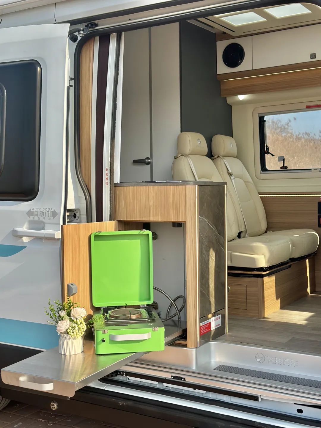 與內(nèi)置廚房相連接的外置廚房區(qū)域,采用抽拉式桌板搭配便攜式柴油爐,上方有遮陽(yáng)棚,還能邊欣賞美景邊做飯。