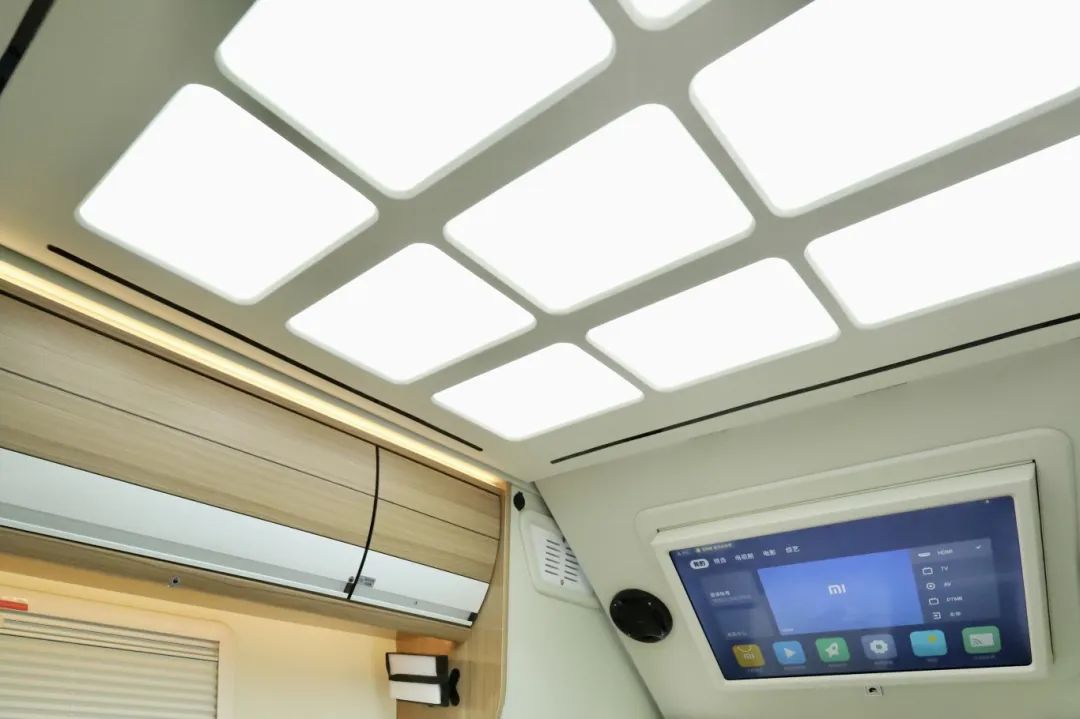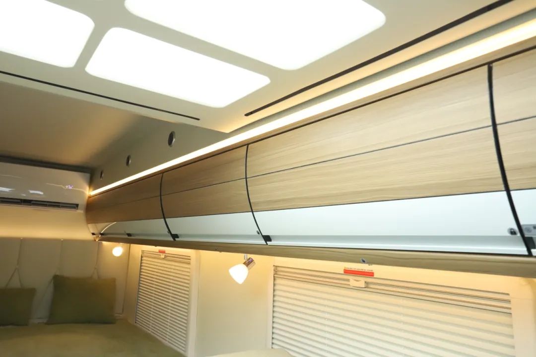 主駕駛一側(cè)還做了四組吊柜,專柜專用都沒問題。車頂有整車氛圍燈以及主照明為車內(nèi)提供良好的光感效果。