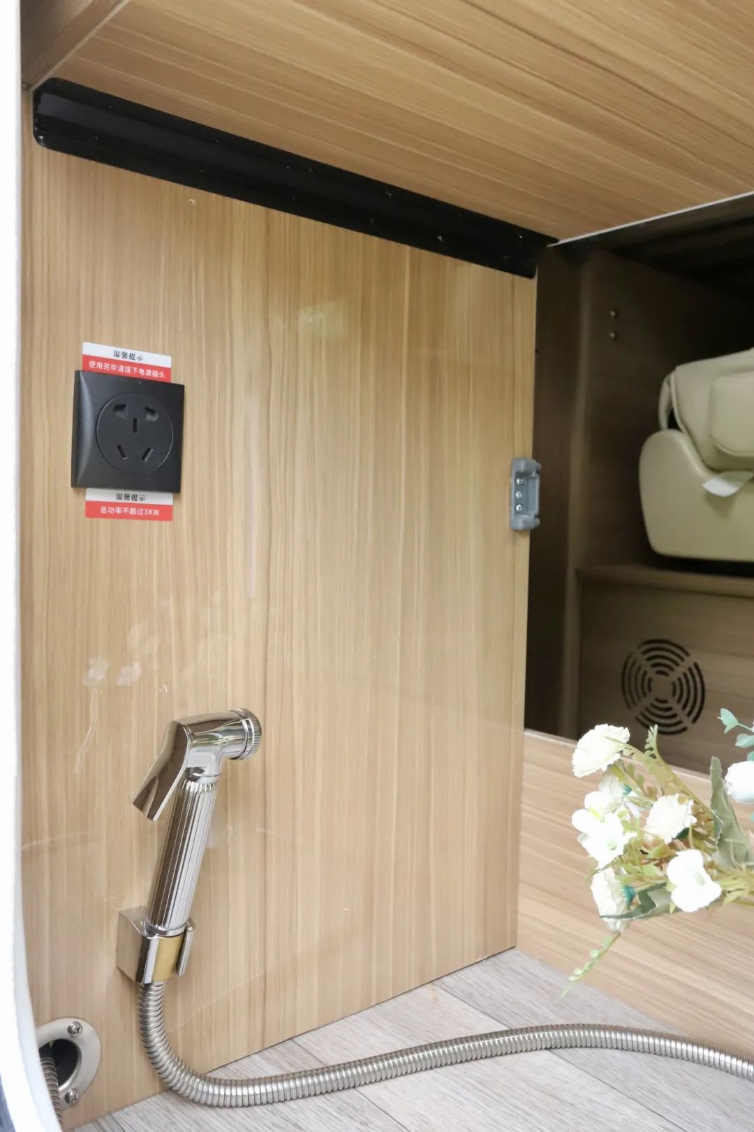 尾部是衛(wèi)生間區(qū)域,空間十分的寬敞,內(nèi)部高度可以達(dá)到一米九的高度,頂部雙向換氣扇為衛(wèi)生間內(nèi)通風(fēng)換氣,還帶獨(dú)立照明系統(tǒng)。