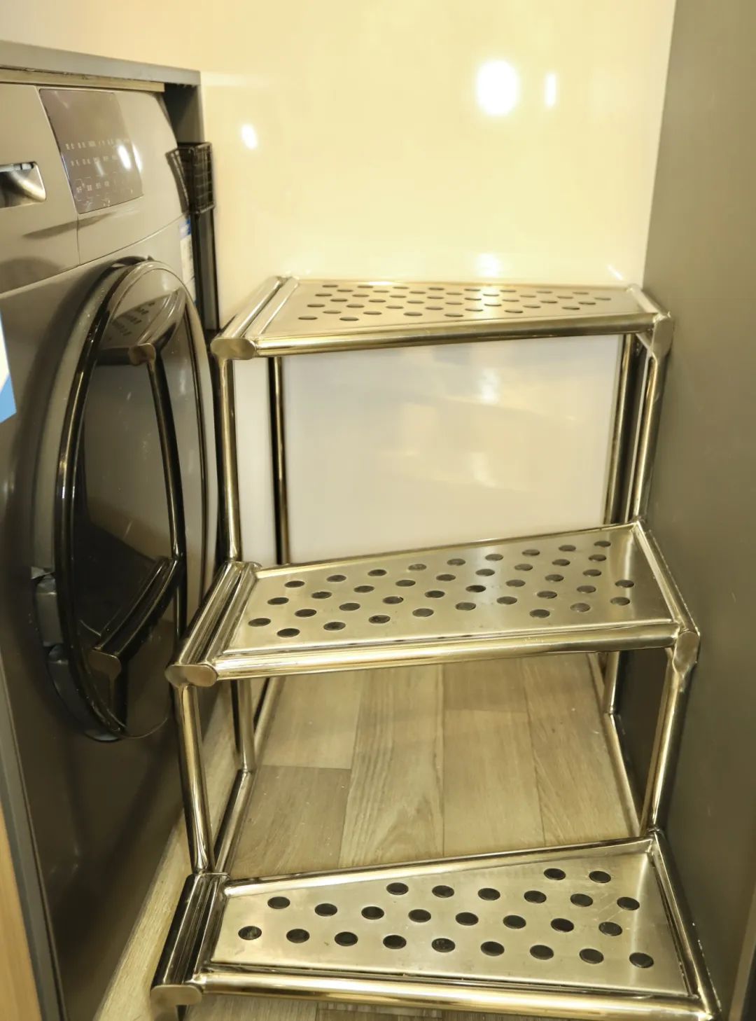 順著樓梯下來,就是一層的區(qū)域了,空間更加通透。旁邊為10公斤家用洗烘一體機,別看現(xiàn)在不能用,將樓梯折疊就能正常使用了,上方的抽屜可以放洗衣液柔順劑,洗衣服的時候拿取超方便。