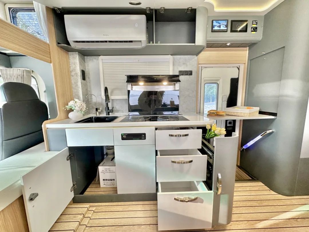 從S688采用的固定式的大餐桌1.0版本,到固定式吧臺可進行拓展的2.0版本,再到現(xiàn)在可以完全隱藏在墻體一側的3.0版本,飛翔房車從未止步,為的就是讓大家旅居的生活更加優(yōu)質。