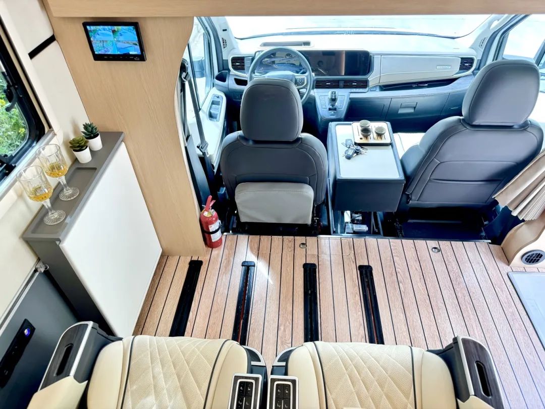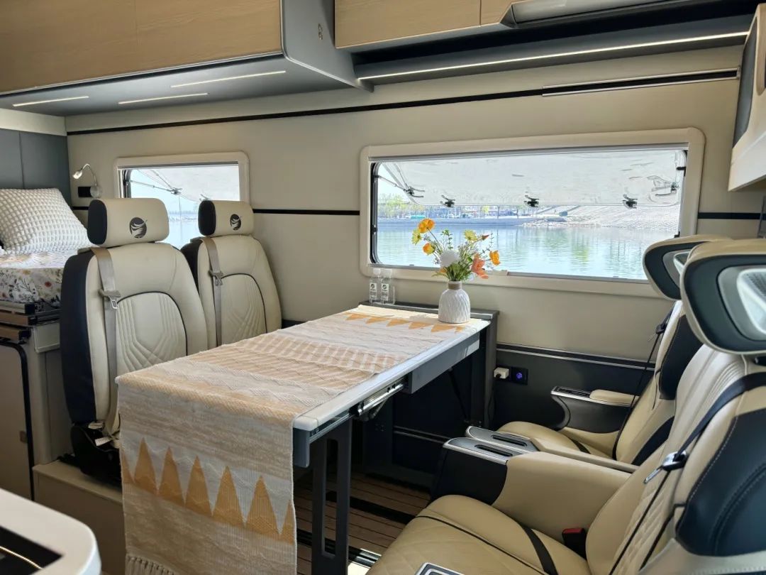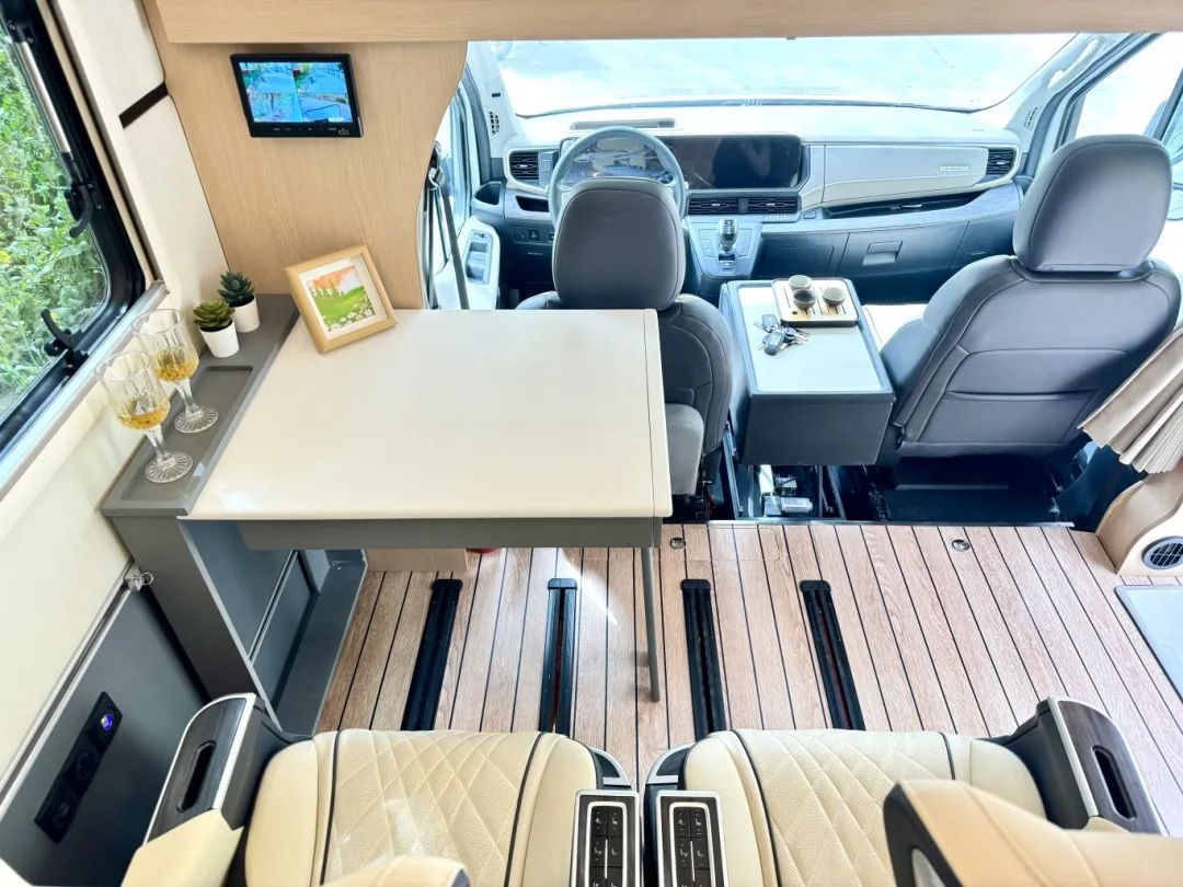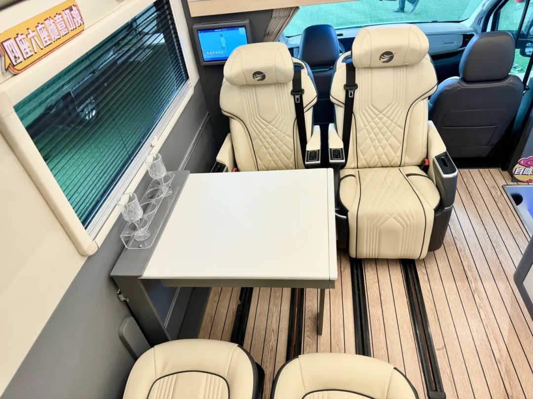 駐車時,二排座椅可后轉(zhuǎn),與三排座椅形成四人對座形態(tài),配合可側(cè)滑至中間的桌子,瞬間變身寬敞會客廳。一家人圍坐在一起,喝茶聊天、打牌娛樂,享受悠閑愜意的時光;孩子們也有了充足的活動空間,嬉笑玩耍,為旅途增添無盡歡樂。