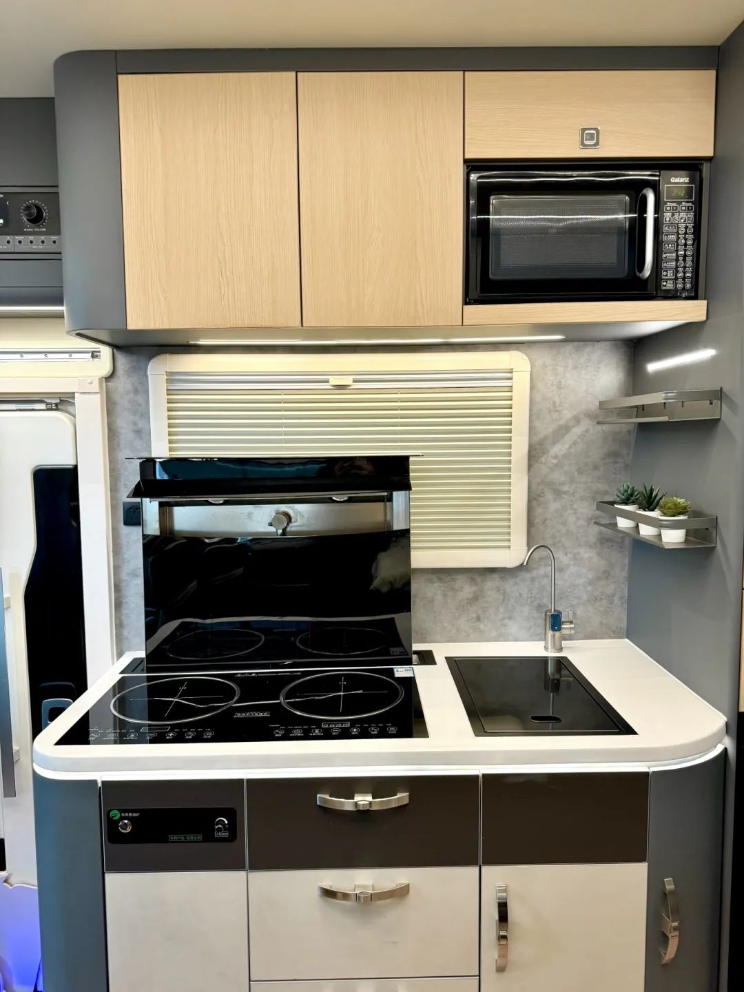 內(nèi)置廚房區(qū)域:可隱藏式升降抽油煙機使用時升起,不用時可隱藏。右側(cè)墻壁增設(shè)調(diào)料盒空間,臺面上下均可儲物,吊柜設(shè)計更適合放置廚房用具。提供雙電磁爐和微波爐,滿足多種烹飪需求。右側(cè)柜體內(nèi)置 76L 冰箱,支持冷藏、冷凍調(diào)節(jié)。