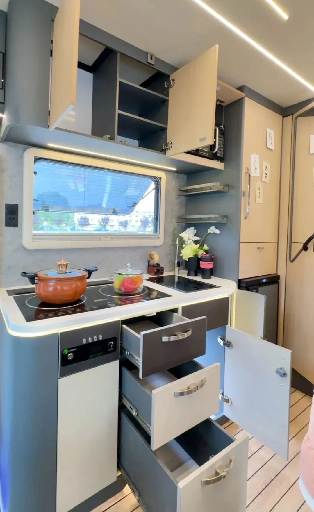 外置廚房區(qū)域:打開車身外側(cè)的拓展面板,一個功能齊全的烹飪空間即刻呈現(xiàn):長2米65、寬0.65米的操作臺面,便攜式柴油爐,火力值最大可達5000W,具有高原模式,內(nèi)外貫通式的儲物空間,做飯鍋具的拿取更加方便,配備了五孔插座和戶外水龍頭,旁邊設(shè)置雙向儲物拉籃里面還設(shè)置了感應(yīng)燈,拉出來使用的時候有燈光加持,更加便捷。此外,外置廚房展板左下方增設(shè)的 166L溫度可調(diào)節(jié)大冰柜,可存放大量肉類和冷凍食品,與內(nèi)置冰箱形成內(nèi)外分區(qū)設(shè)計,大幅提升儲物容量。