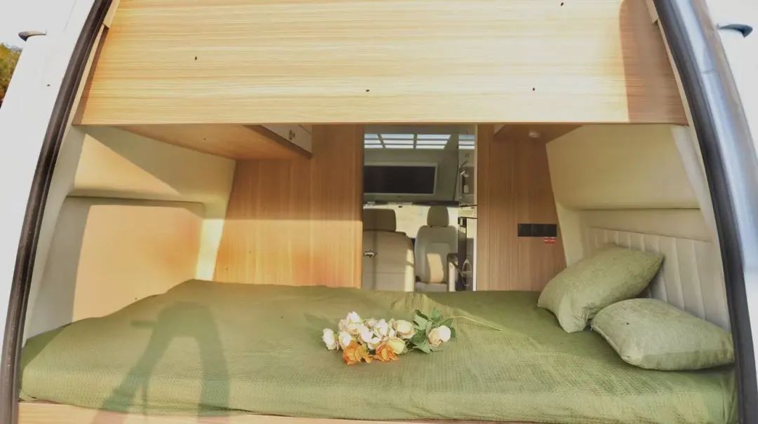后置大橫床,隱私性極好,即使別人在外面也不會看到床的位置,尺寸可以達(dá)到1.3米×1.9米,一張雙人床,能滿足大部分人的睡臥需求的,在床頭和床尾也都安裝了吊柜,可以放置日常的換洗衣物;晚上睡覺再拉上隱私簾,這里就是一個私密的小空間。